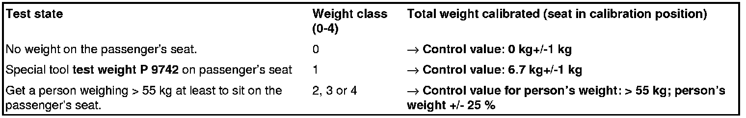 10.1.2. Place the special tool test weight P 9742 on the passenger's seat. The Passenger Airbag Off indicator light in the centre console must come on. Compare values (see table below) using the PIWIS Tester.