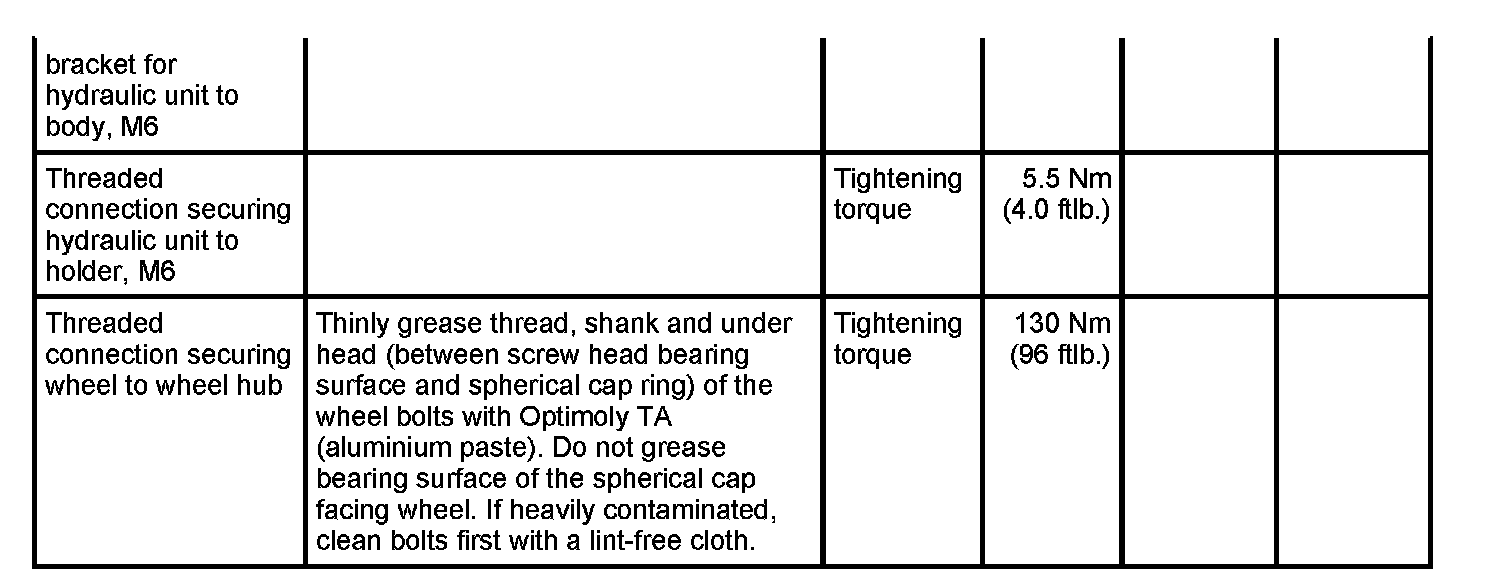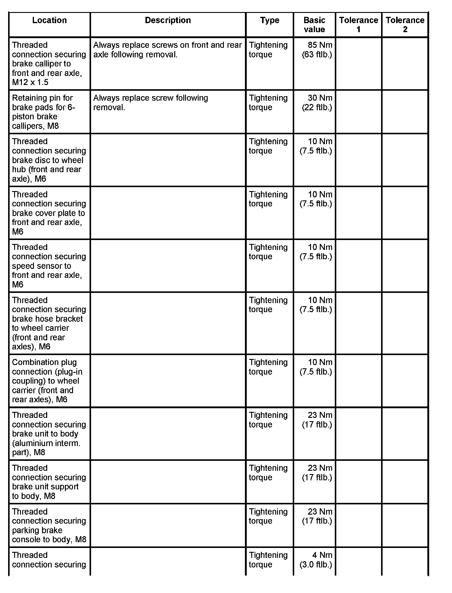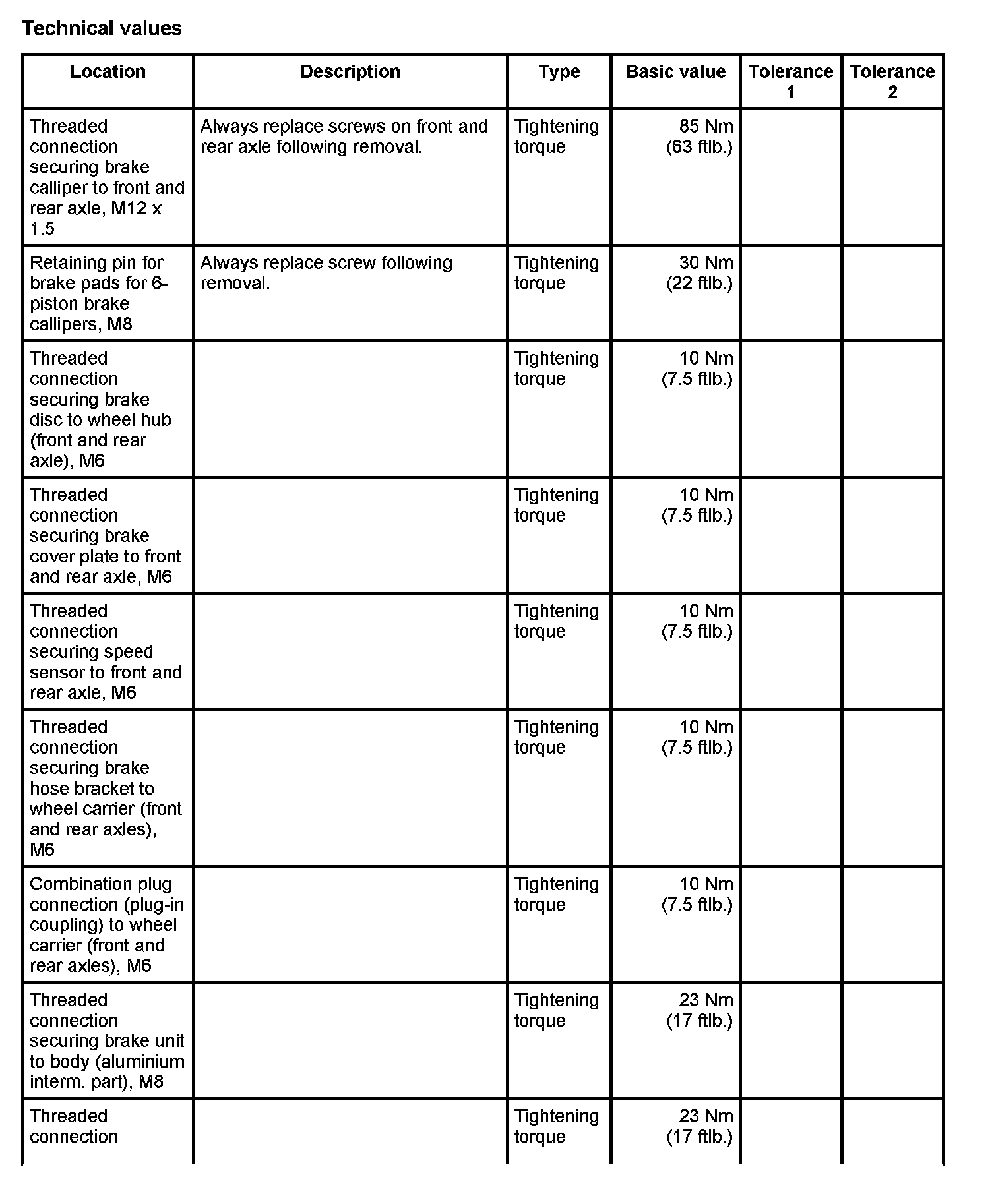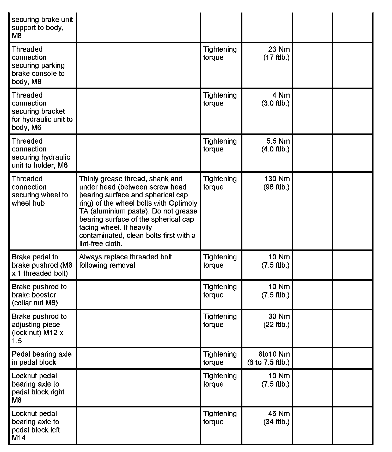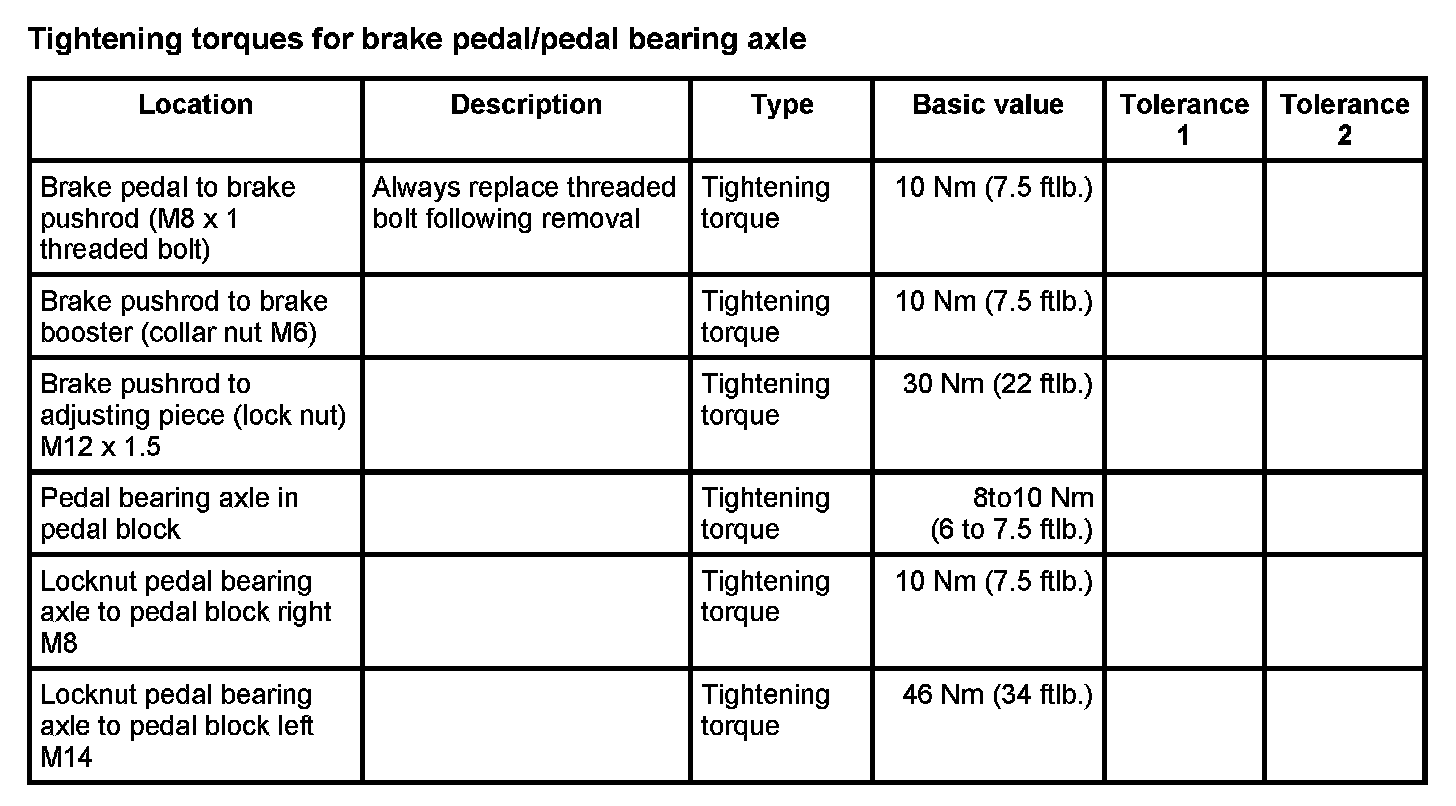 Tightening torques for mechanical brake