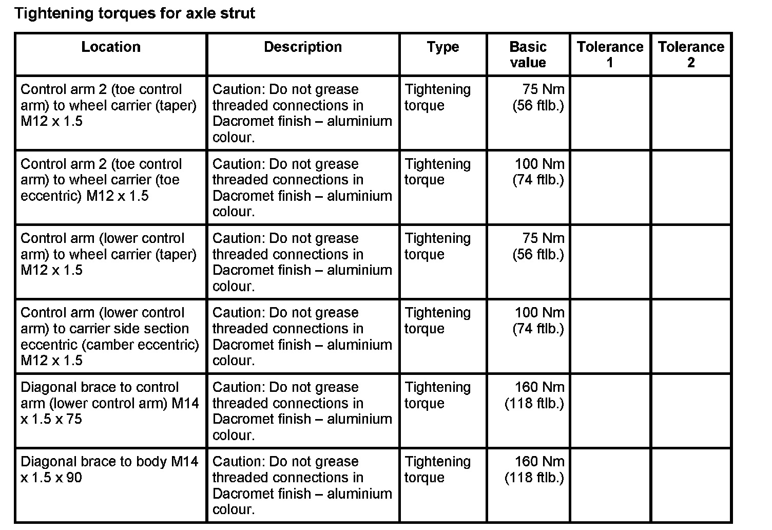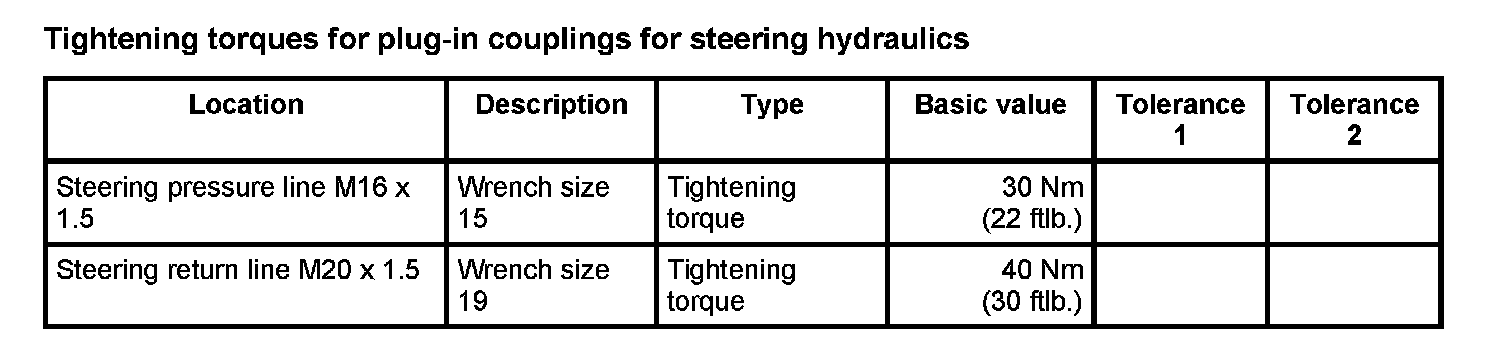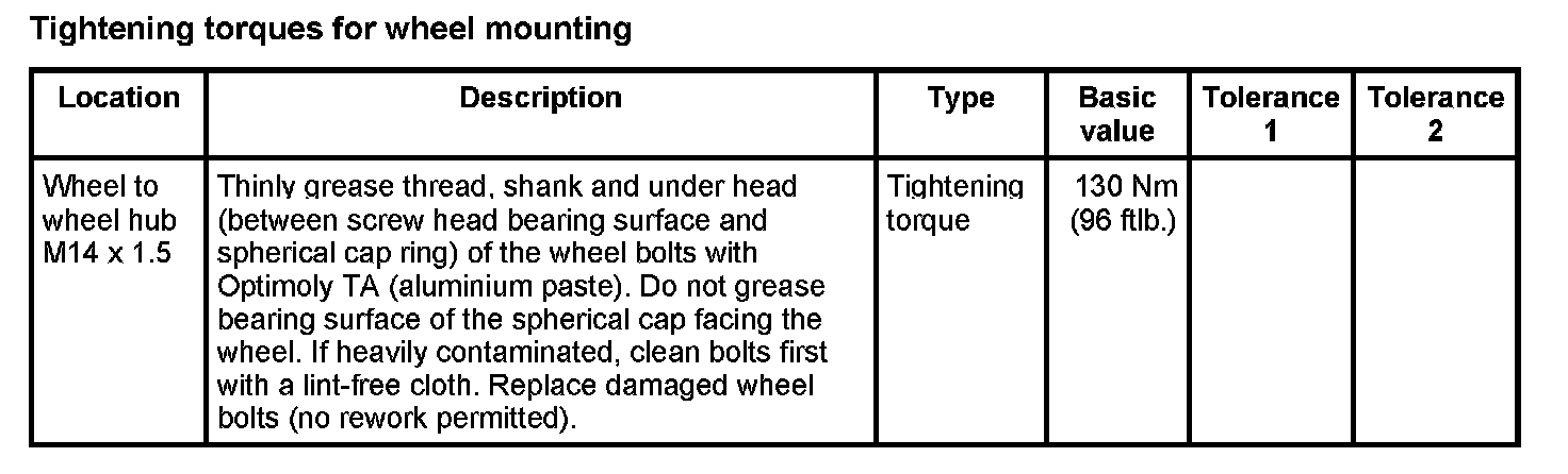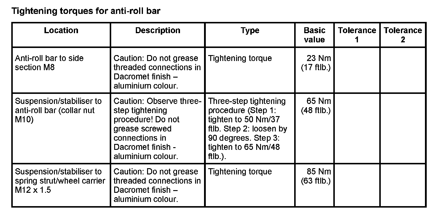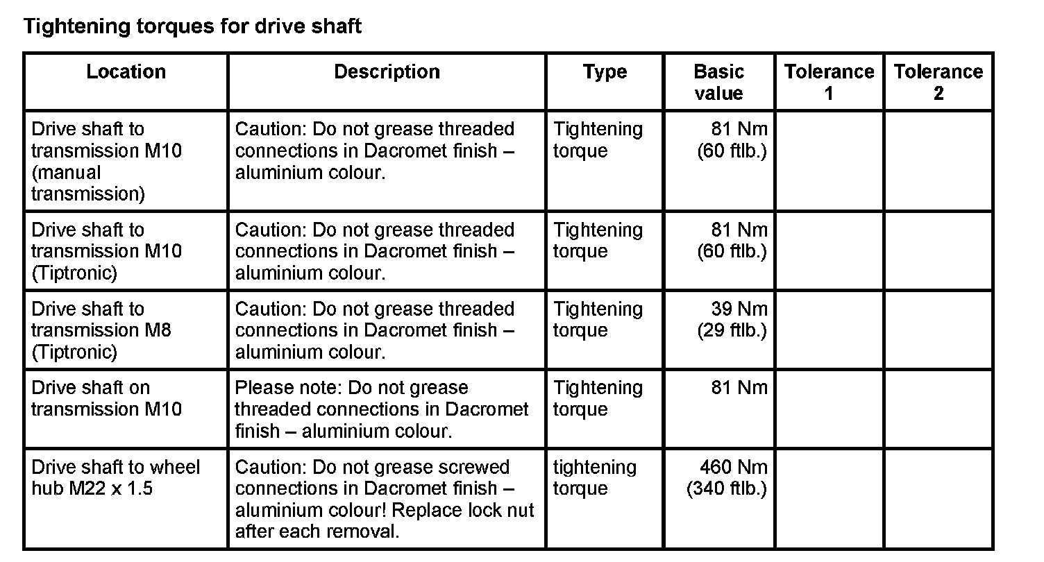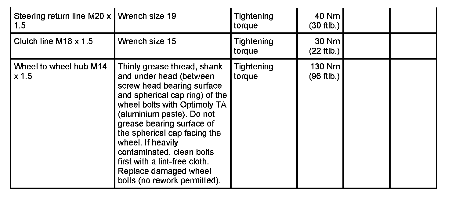 Tightening torques for rear axle
