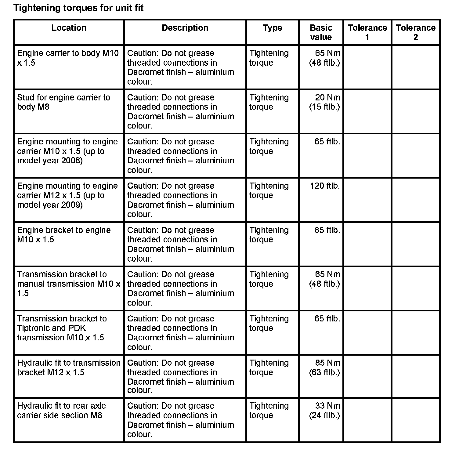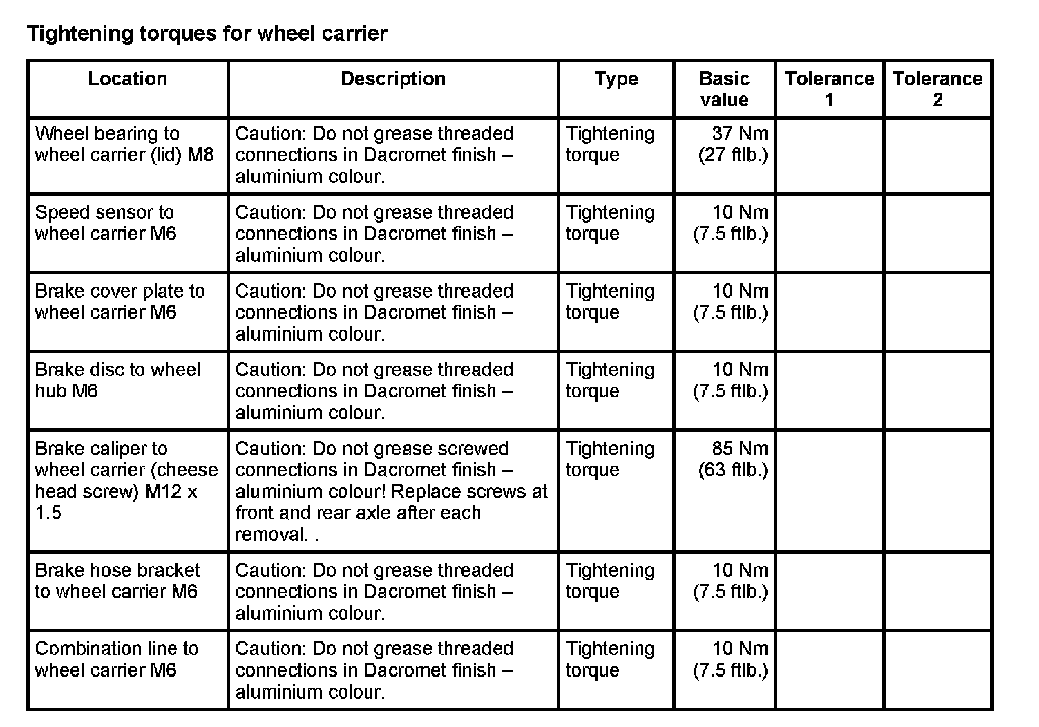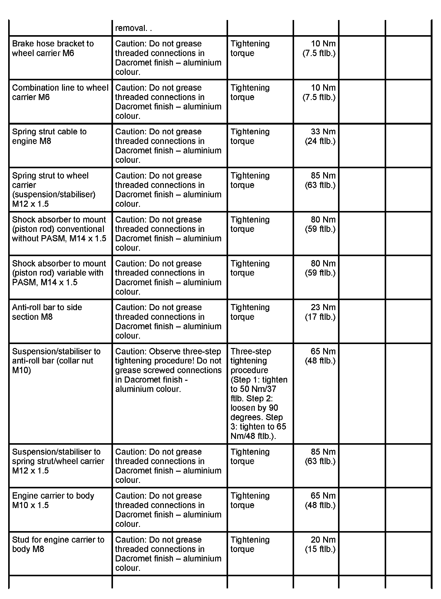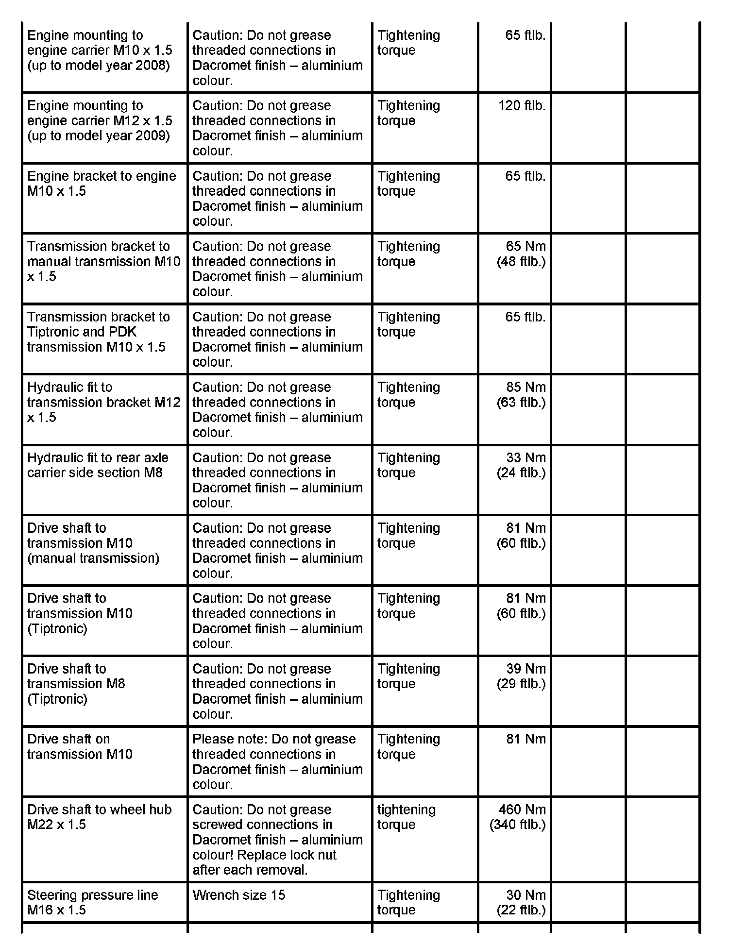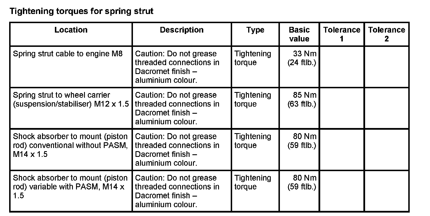 Tightening torques for rear axle