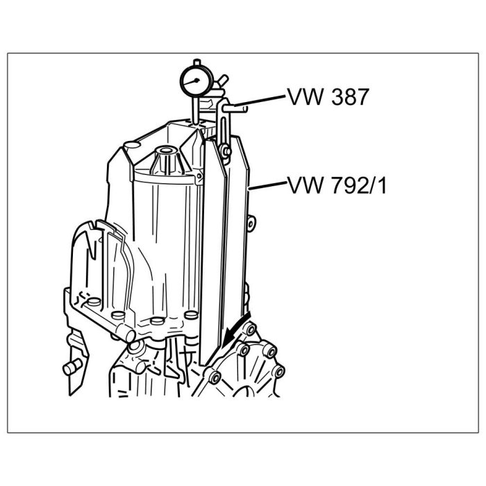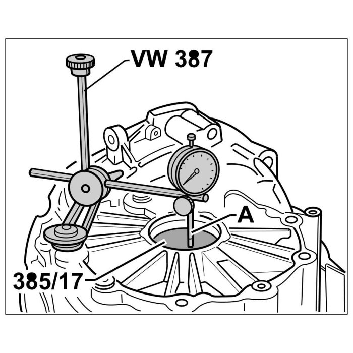 6. Secure the dial gauge holder VW 387 with the dial gauge and extension to the housing, and set to 0 with 1 mm preload.