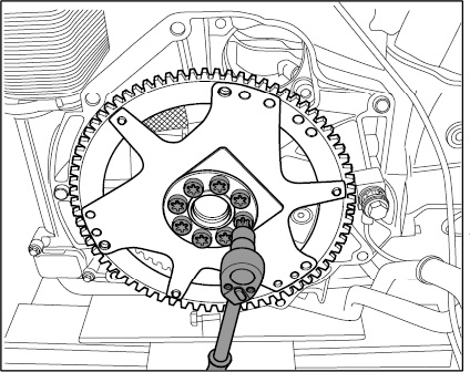 2. Loosen and unscrew eight M10 x 25 fastening screws on the drive plate. Remove drive plate.