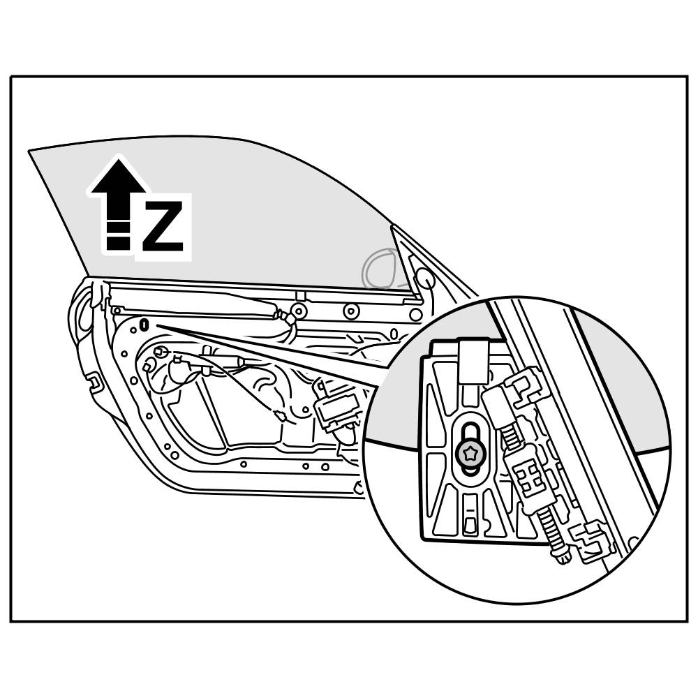 7.3. Slide the door window glass in position -Z- upward in the slot at the rear mounting piece (B-pillar) until the glass edge is flush with roof frame 2. Adjust at the adjusting screws on the drivers if necessary.