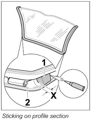 1. Stick a profile section -1- to the side of the windstop middle section -2- in area measuring -X= 5 mm- using -Loctite 406-.