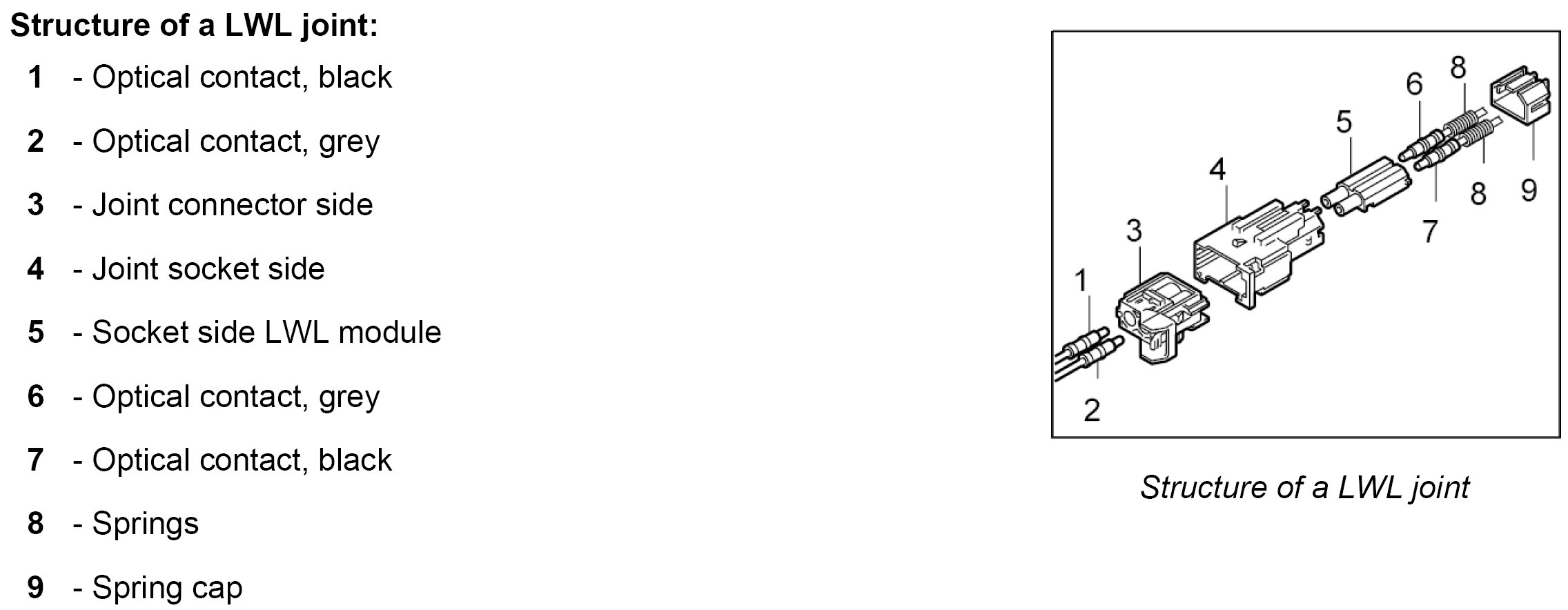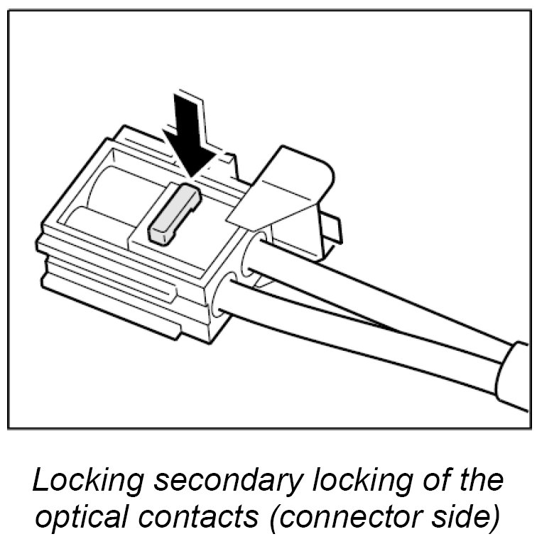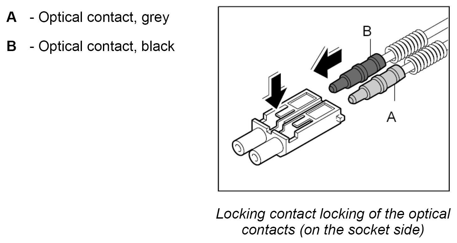 The LWL is delivered with affixed plastic contacts. These contacts are latched in the connector housing in the case of repairs. Grey and black contacts with identical mechanical dimensions are used.