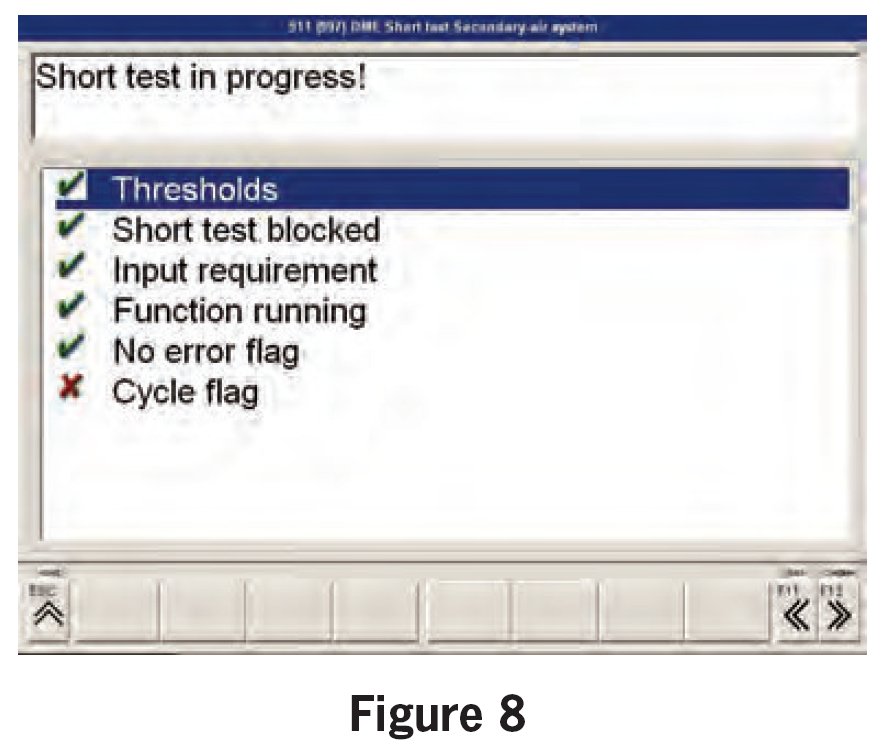 If the "Secondary-air system (total)" flag is the only flag that is not checked, this means that the short test has finished and the diagnosis was performed. However, the cycle flag for "Oxygen sensor plausibility" was not set or the "Basic mixture adaption" was not performed correctly.