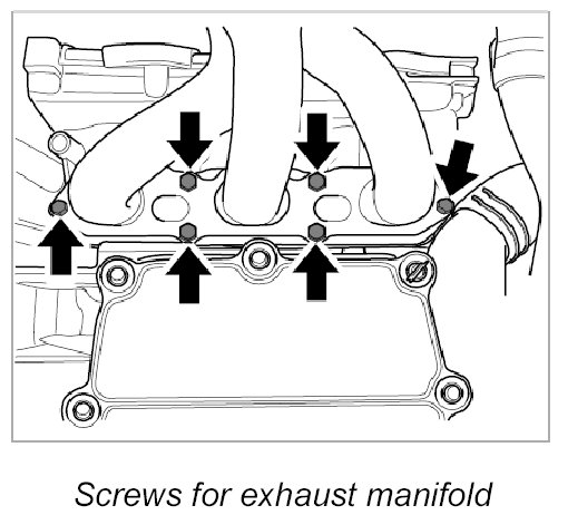 1. Remove the exhaust manifold. Unscrew six hexagon-head bolts (M8 x 26) -Arrows- on the cylinder head. Get another person to hold the component if necessary.