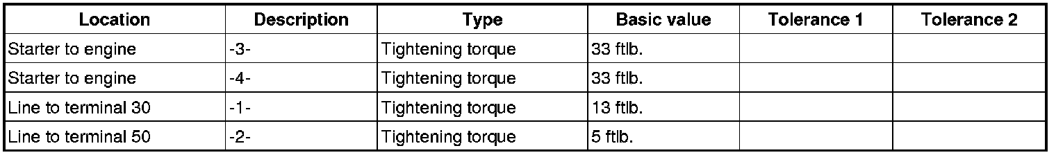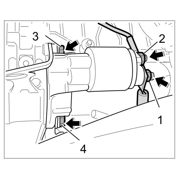 1. Insert starter into the bracket from above and install with the upper fastening screw -3-. => Tightening torque: 33 ftlb.