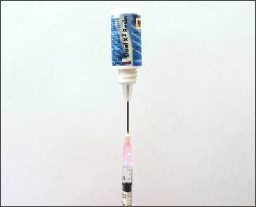 1.2. Attach needle to syringe and fill with approx. 0.15 ml of resin. => Filling syringe