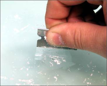 8.1. Remove film and scrape off excess resin using a razor blade held at a 90 degree angle to the windscreen. => Scraping off resin