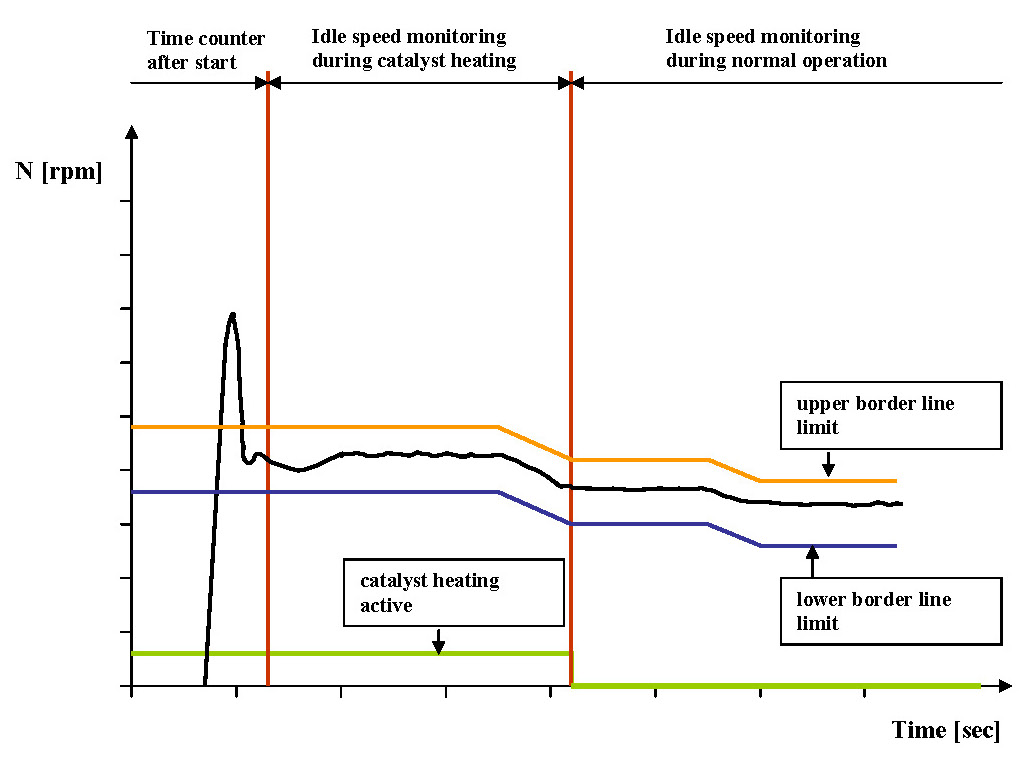 According to (e)(11.2.1), the individual component related to the above strategies has to be monitored. The table below demonstrates that all catalyst heating measures are covered by components which are monitored individually. The long term fuel system and the valve lift diagnosis, which need a lambda signal for monitoring, are finished after the catalyst warm-up phase. Errors will be detected before the next catalyst warm-up.