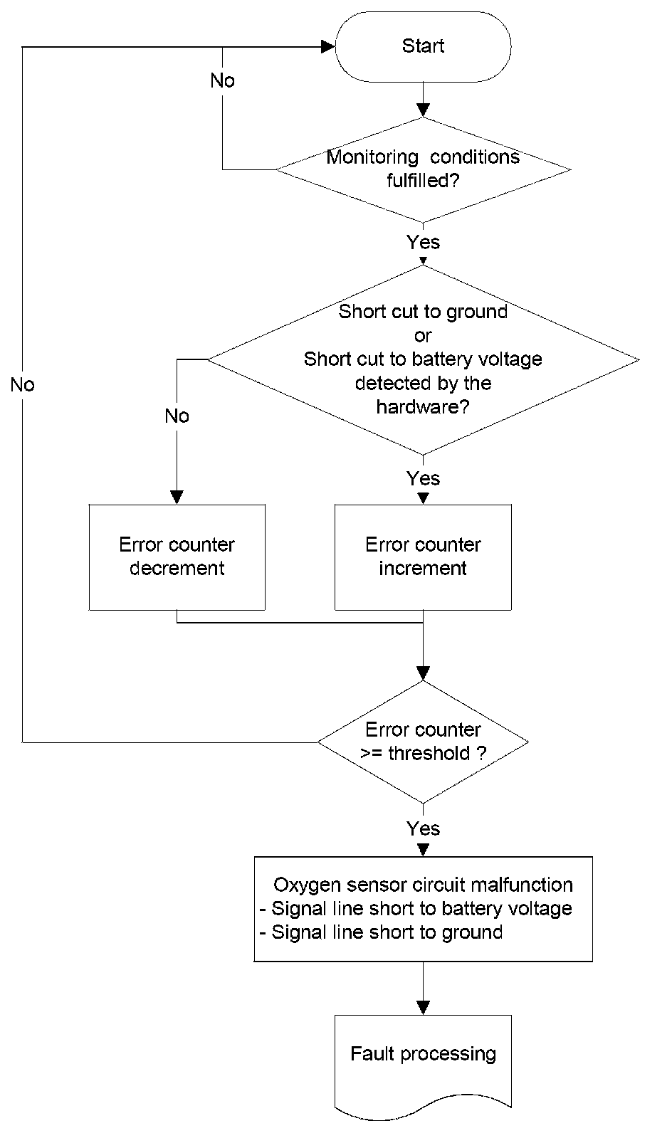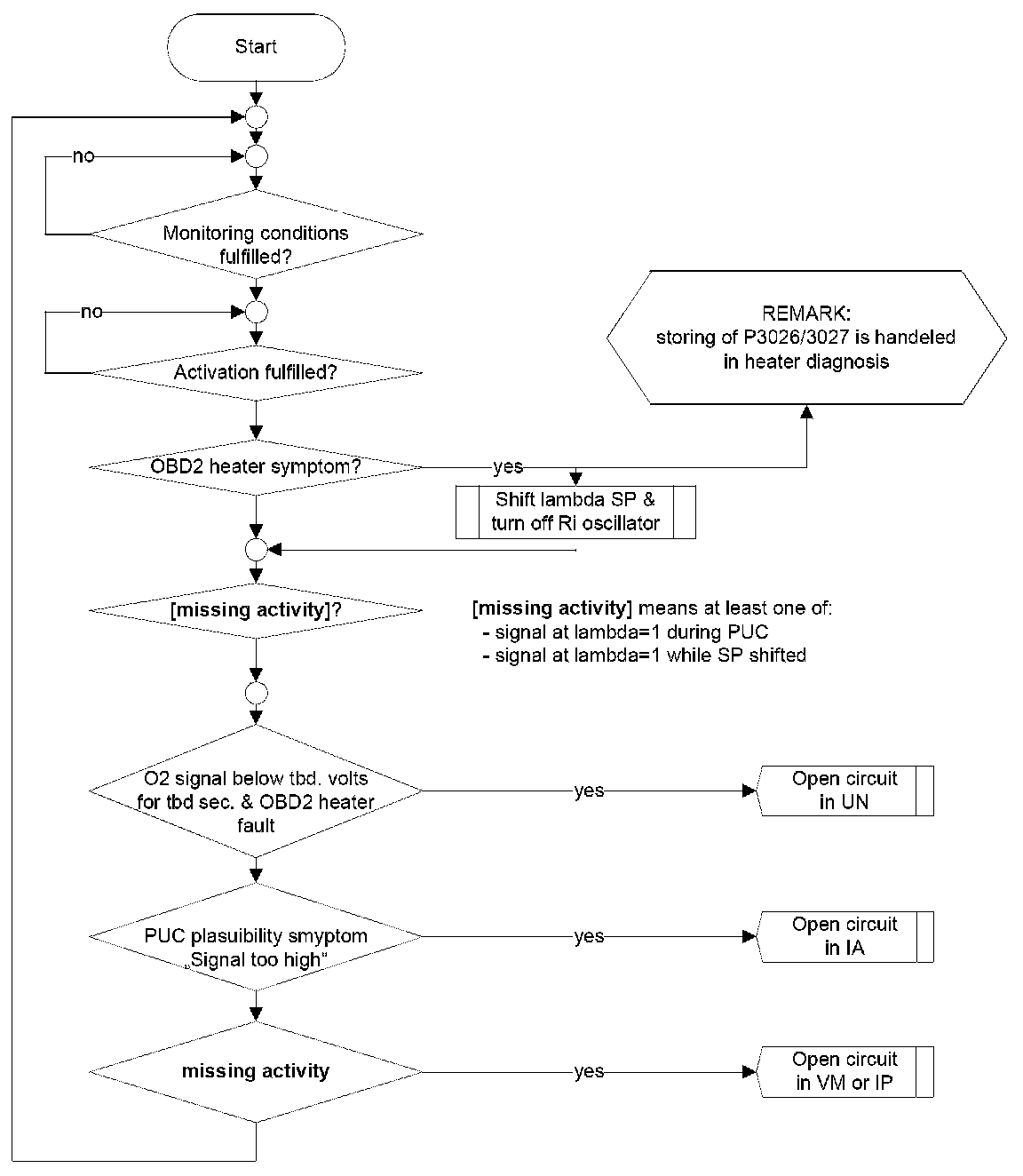 An open circuit in line Virtual Ground or in the line Pumping current can be detected if the sensor signal sticks near lambda 1. The sensor non-activity can be detected by the Oxygen Sensor Signal Monitoring During Fuel Cut-off (signal voltage below e.g. 2,1 V) in fuel cut off or WRAF sens activity check.