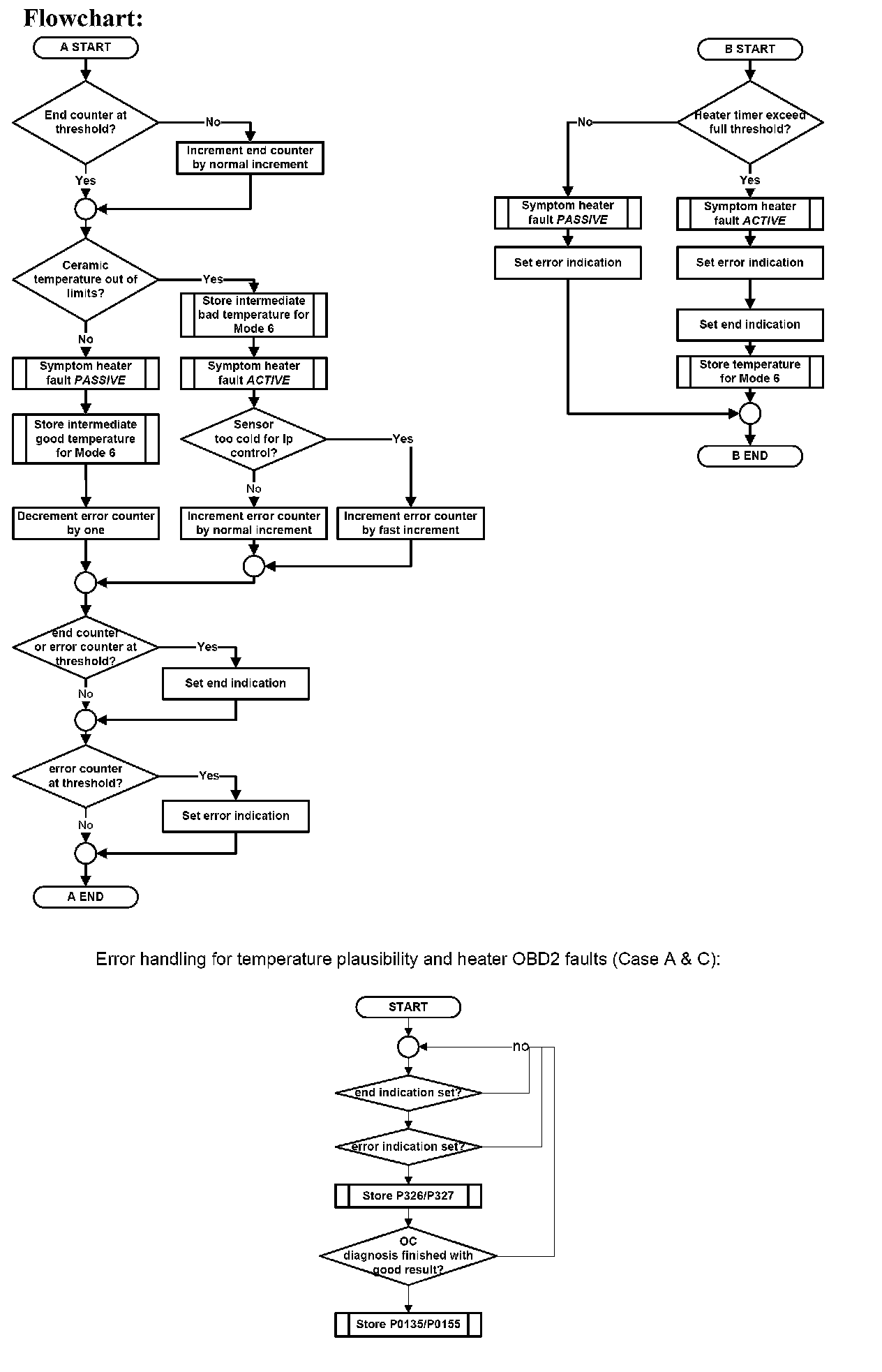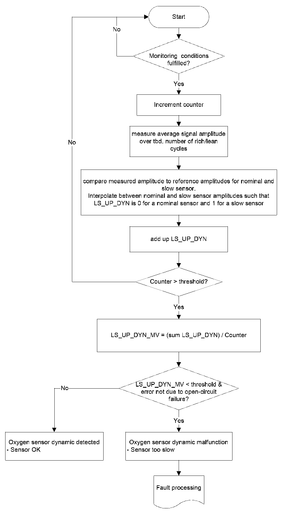 1. Part one monitors the downstream sensor voltage during active fuel trim controller p-share. If the fuel trim control is active, the downstream sensor voltage must be in a band around the trim control set point. If the voltage is outside this band, a mass air flow integral is incremented. If this integral is over a threshold, a malfunction is detected (see also picture below.). When the downstream sensor voltage will not switch to rich before the integral is over a threshold after a fuel cut-off phase, then this fault will be stored, too.