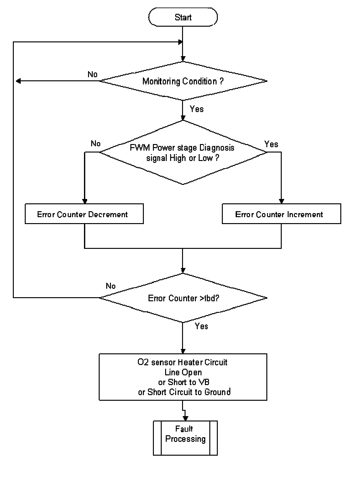 The purpose of this monitor is to detect errors within the O2 Sensor Heater Circuit. The signal for the O2 sensor heater is pulse-width modulated. The signal of the power stage is monitored internally by the driver. The driver can distinguish between three symptoms: