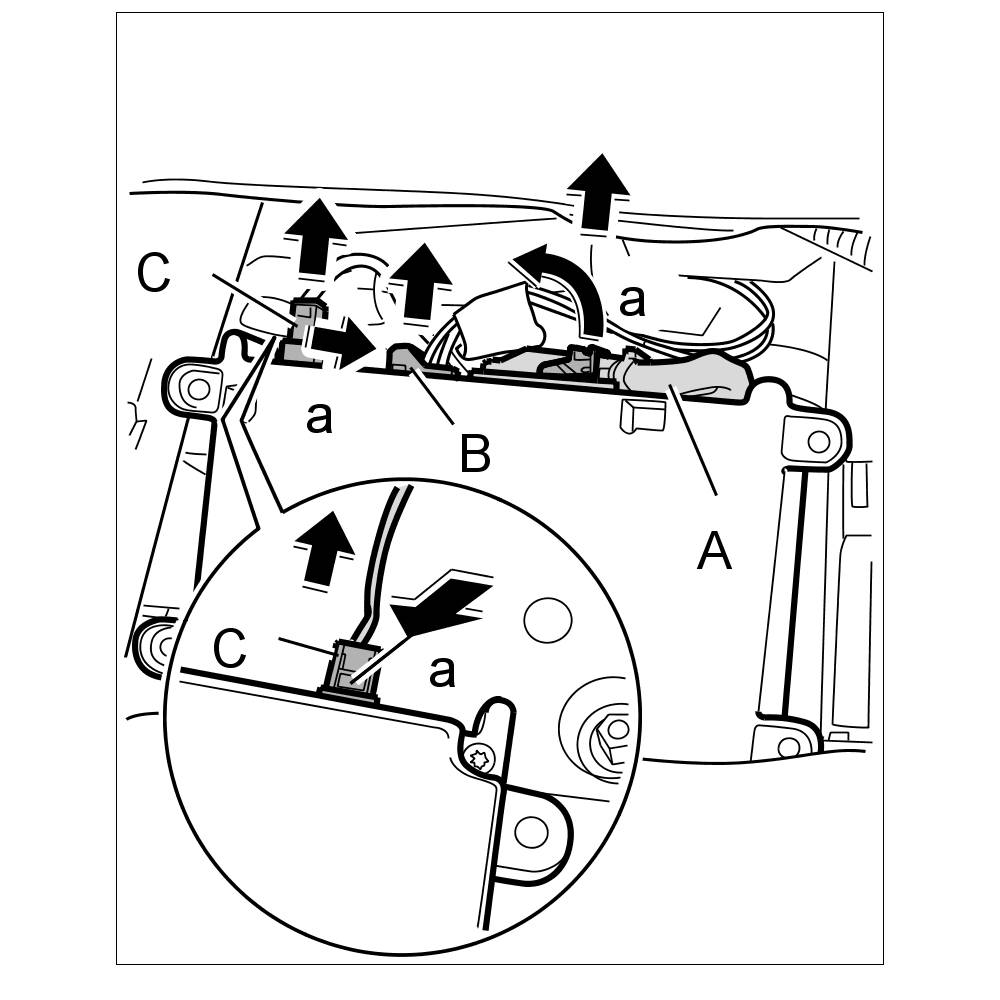 5. Turn over control unit, press latch on the antenna plug -C- and remove plug.