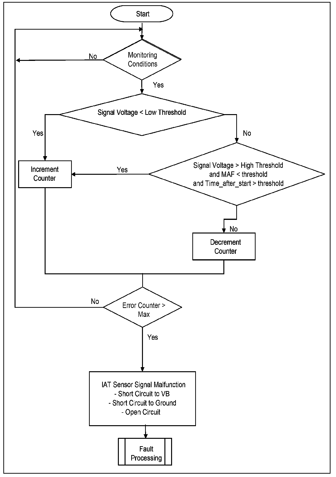 This diagnosis checks IAT for a Stuck signal. If the vehicle was driven for a minimum required distance and time-after-start, then the change in the IAT signal during this period should be above a calibrate able threshold. If this is not the case, a stuck IAT signal is detected.