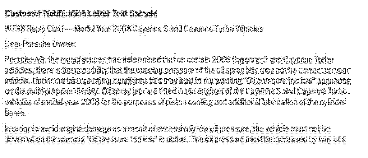 This is to inform you of a voluntary Workshop Campaign on certain 2008 model year Cayenne S and Cayenne Turbo vehicles. There is the possibility that the opening pressure of the oil spray jets does not comply with the specifications. Under certain operating conditions this may lead to the warning "Oil pressure too low" appearing in the multi-function display. In order to avoid engine damage as a result of excessively low oil pressure, the vehicle must not be driven when the warning "Oil pressure too low" is active.
