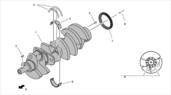 Select crankshaft bearing shell classification based on the inscription on the crankshaft's flywheel flange -9-. Example: YYYYB YYYY mean 5 main shaft bearings and 4 double connecting rod bearings (8 connecting rods in total). The letters are the abbreviations for the color code of the bearing shells (Y for yellow, B for blue, R for red). Based on the example above, yellow bearing shells are to be selected for the main shaft bearings 1 to 4 and a blue bearing shell is to be selected for the fifth main shaft bearing. The connecting rod bearing shells should all have a yellow marking in this case.