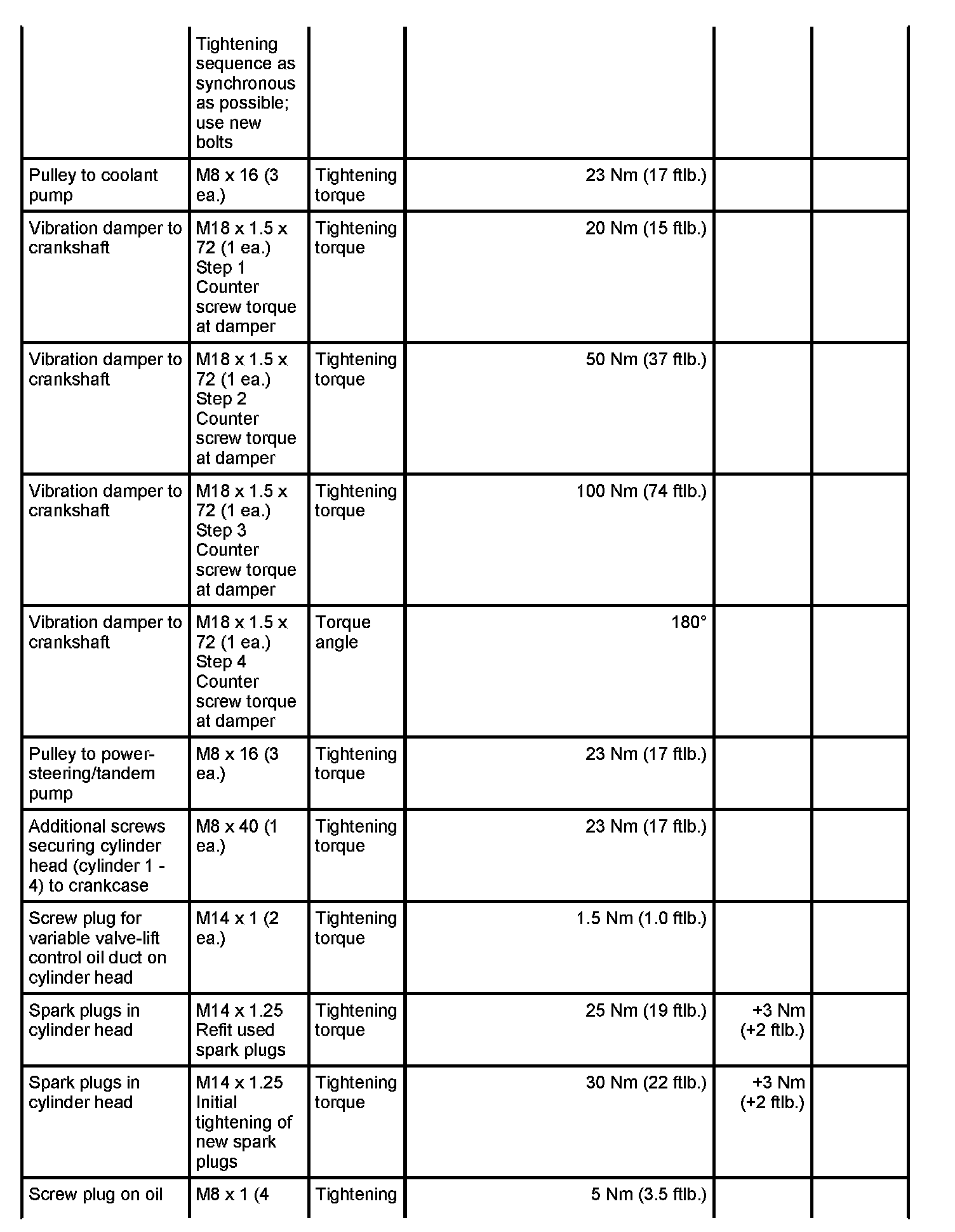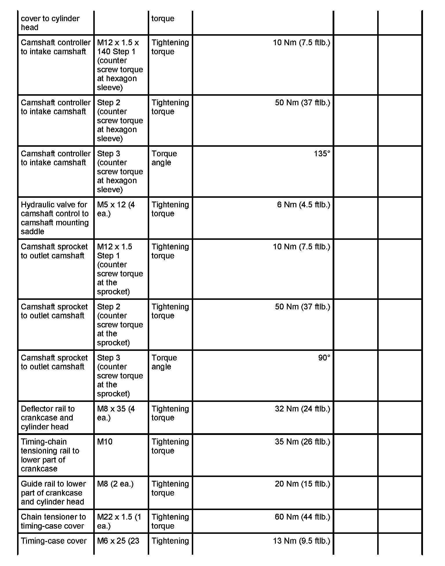 1 - Screw, M12 Tighten completely after setting timing!; 1st turn - Tightening torque: 10 Nm (7.5 ftlb.) 2nd turn - Tightening torque: 50 Nm (37 ftlb.) final tightening (torque angle) - Torque angle: 135 degrees