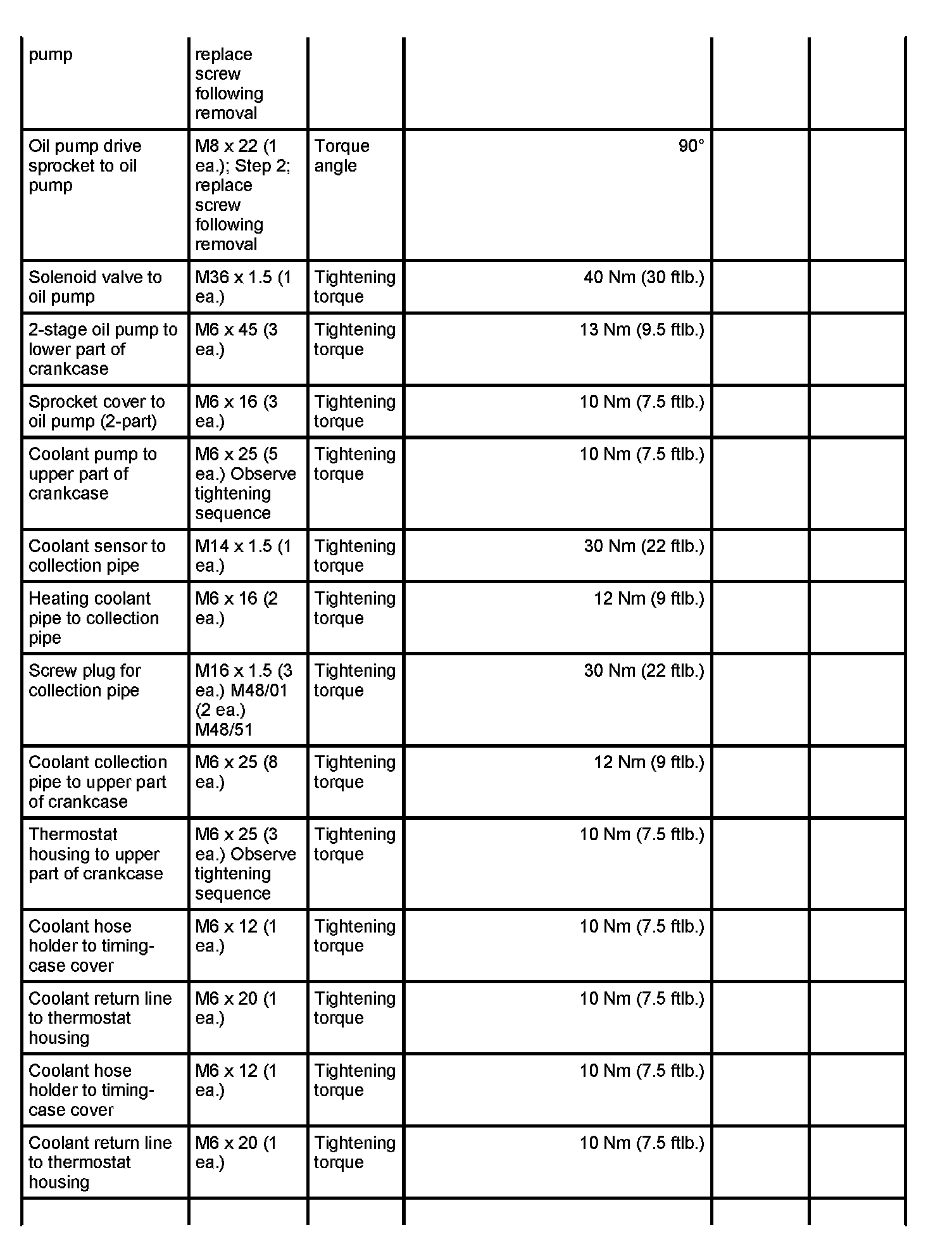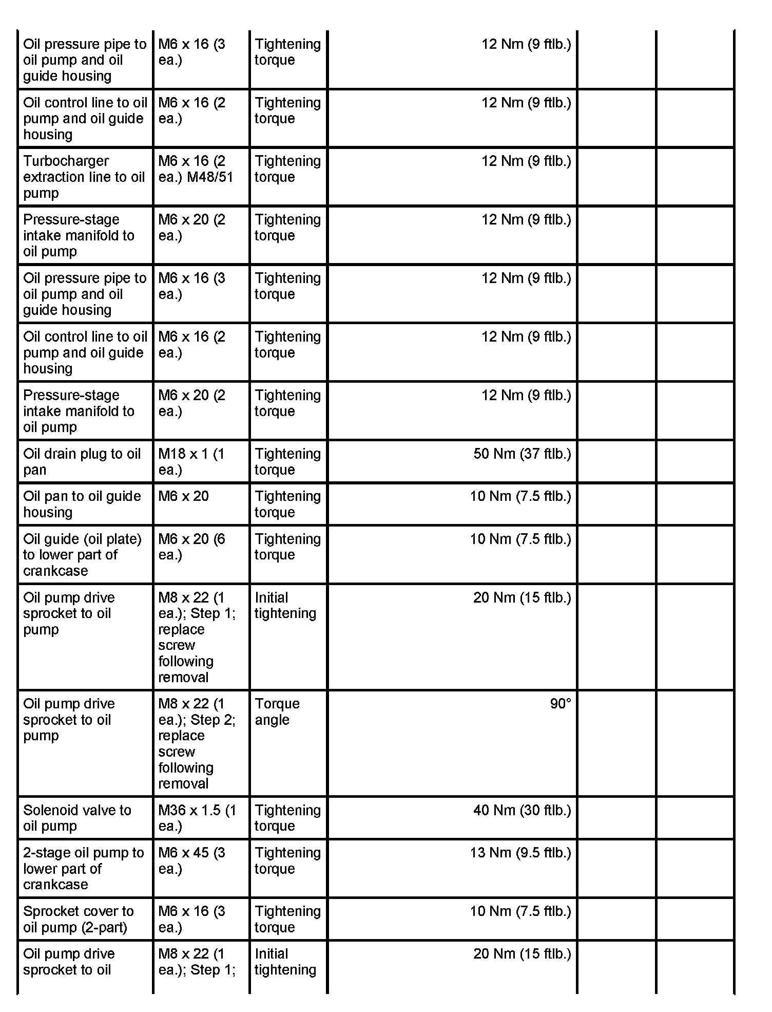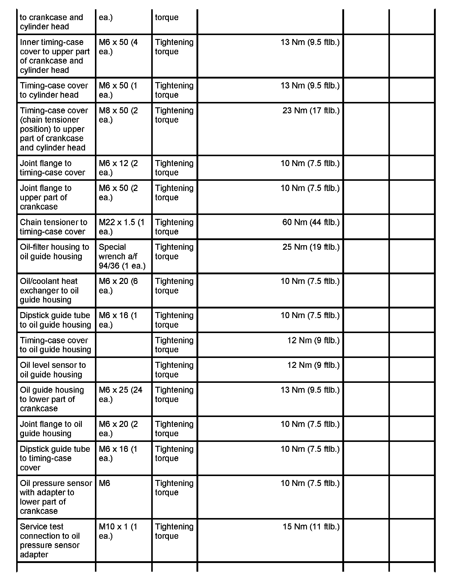 6 - Screw, M6 x 25; timing-case cover to oil guide housing - Tightening torque: 12 Nm (9 ftlb.). oil level sensor to oil guide housing - Tightening torque: 12 Nm (9 ftlb.) oil guide housing to lower part of crankcase - Tightening torque: 13 Nm (9.5 ftlb.)