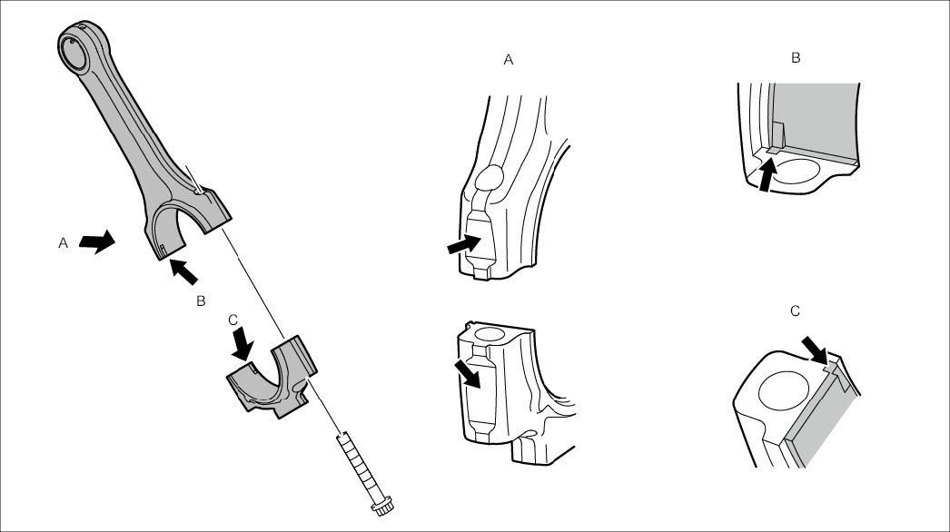 2 - Piston; different on naturally aspirated and turbo engines; combustion chamber recess facing center of engine; left and right different; direction of travel arrow in direction of travel