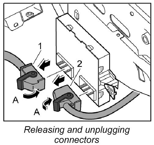 4. Release both electrical connectors -1, 2- -A- and unplug them from the control unit.