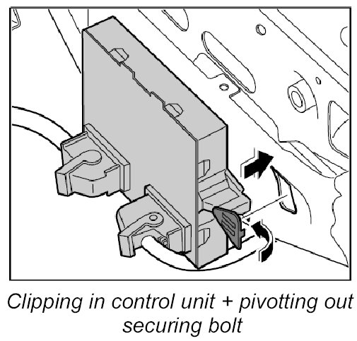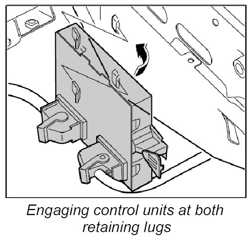 2. Engage control unit in support for wiring harness with both retaining lugs.