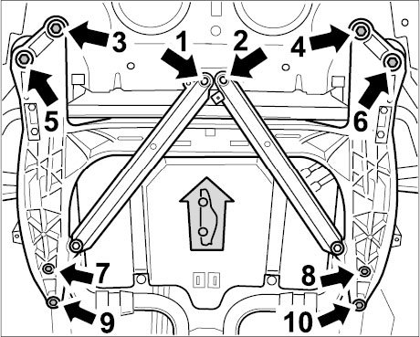 7. Remove diagonal braces (2 screws -1 + 2- and 2 M12 nuts on front-axle cross member).