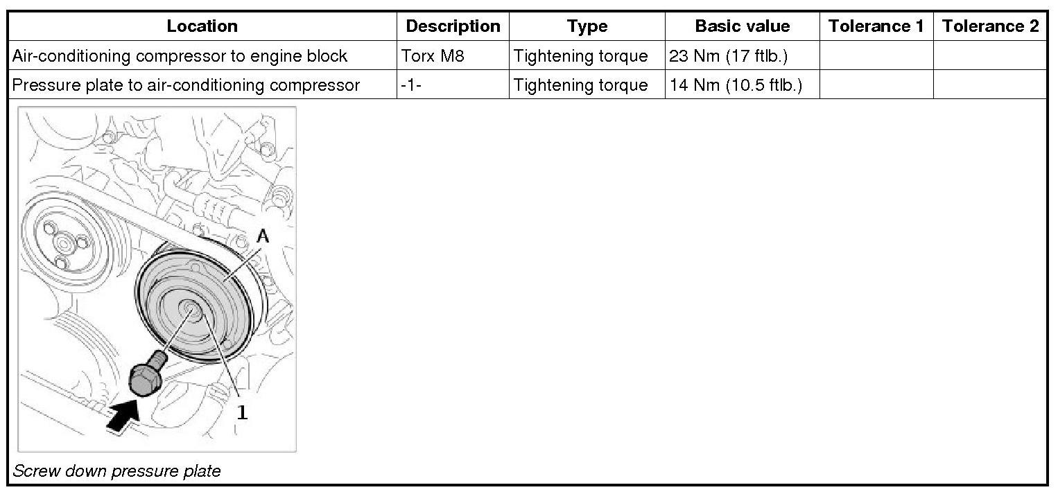 5.3. Screw in rear Torx screw for air-conditioning compressor (M8 x 120) -1- and tighten all three screws for air-conditioning compressor. => Tightening torque: 23 Nm (17 ftlb.).