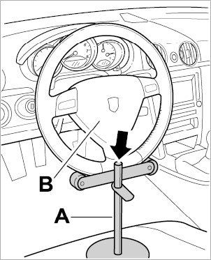 Clamp steering wheel in centre position with steering wheel holder -A-. Use only steering wheel holders that do not project into the area of the airbag unit -B-! If necessary, shorten the guiding rod of the steering wheel holder at top -Arrow-.