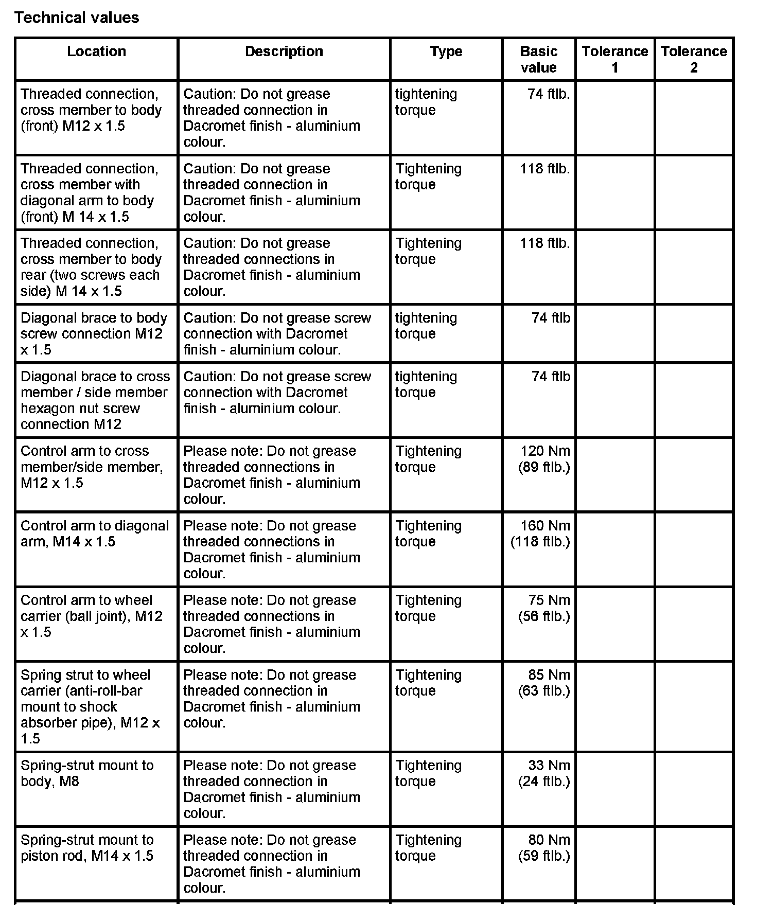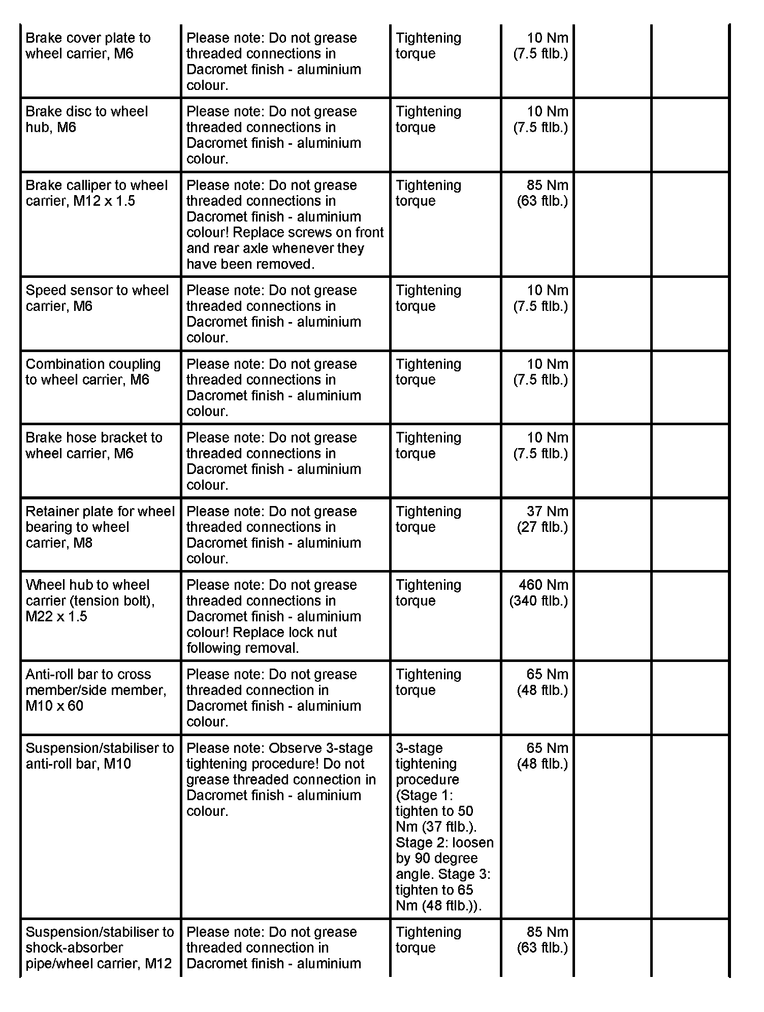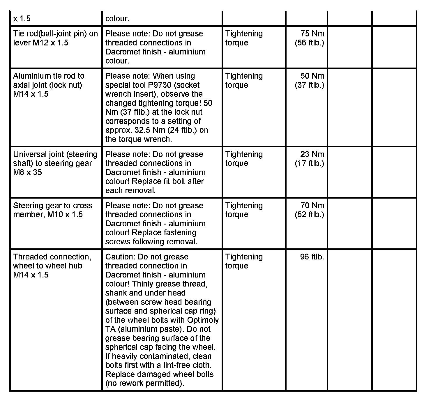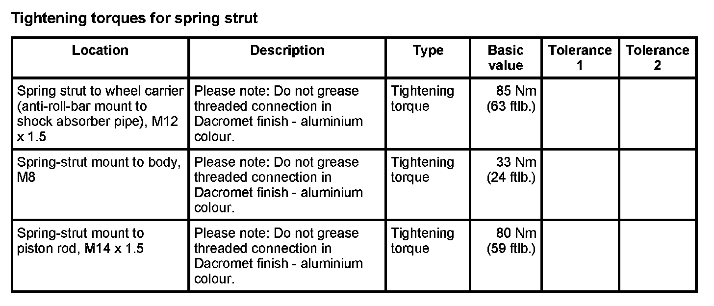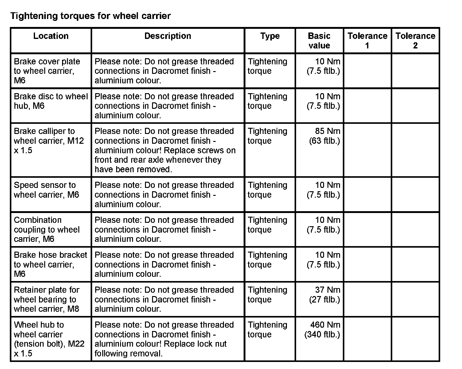 WM 400000 Tightening torques for front axle