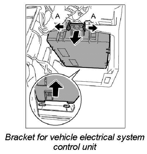 1. Pull apart the locking tabs -A- for the vehicle electrical system control unit, pull the control unit forward and down with connectors still attached, then pull it out of its holder at the rear.