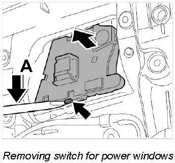 2. Lever off switch for power windows at the locking tab -arrow- (-arrow A-) and remove it.