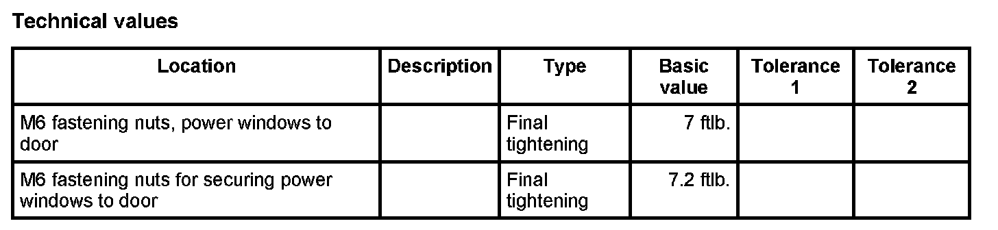 2. First position the lower fastening points of the power windows -1- to the dimension -X = 5 mm- and tighten with fastening nuts - 2-. Tightening torque: Final tightening : 7 ftlb.