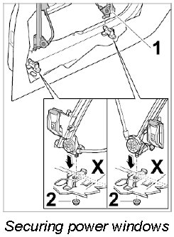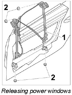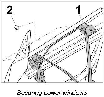 3. Unscrew fastening nuts -2- on power windows -1-.