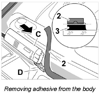 1. When removing remaining adhesive -2- with the cutting tool -C- and the flashing knife -D- on the body, ensure that a surface coating of adhesive remains -3-.