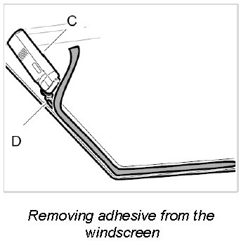 1. Equip cutting device -C- with the flashing knife -D- and remove the remaining adhesive from the windscreen, ensuring that a surface coating of adhesive remains.