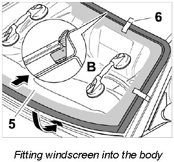 1. Apply suction cups -B- to the windscreen -5- and insert the windscreen into the window aperture. Press the windscreen -5- up as far as it will go. When doing so, press the lower edge of the glass against the spacer blocks. Mark the windscreen with adhesive tape -6- and remove.