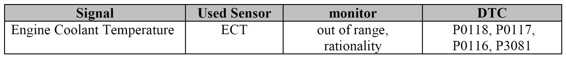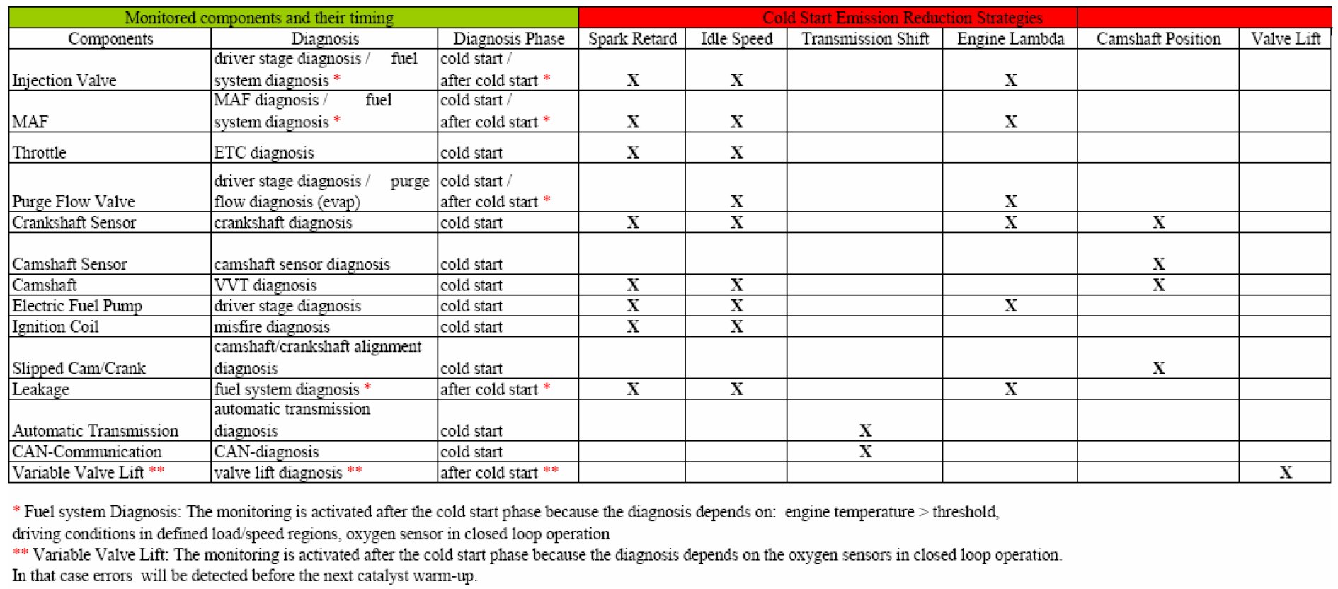 According to (e)(11.2.1), the individual component related to the above strategies has to be monitored. The table below demonstrates that all catalyst heating measures are covered by components which are monitored individually. The long term fuel system and the valve lift diagnosis, which need a lambda signal for monitoring, are finished after the catalyst warm-up phase. Errors will be detected before the next catalyst warm-up.