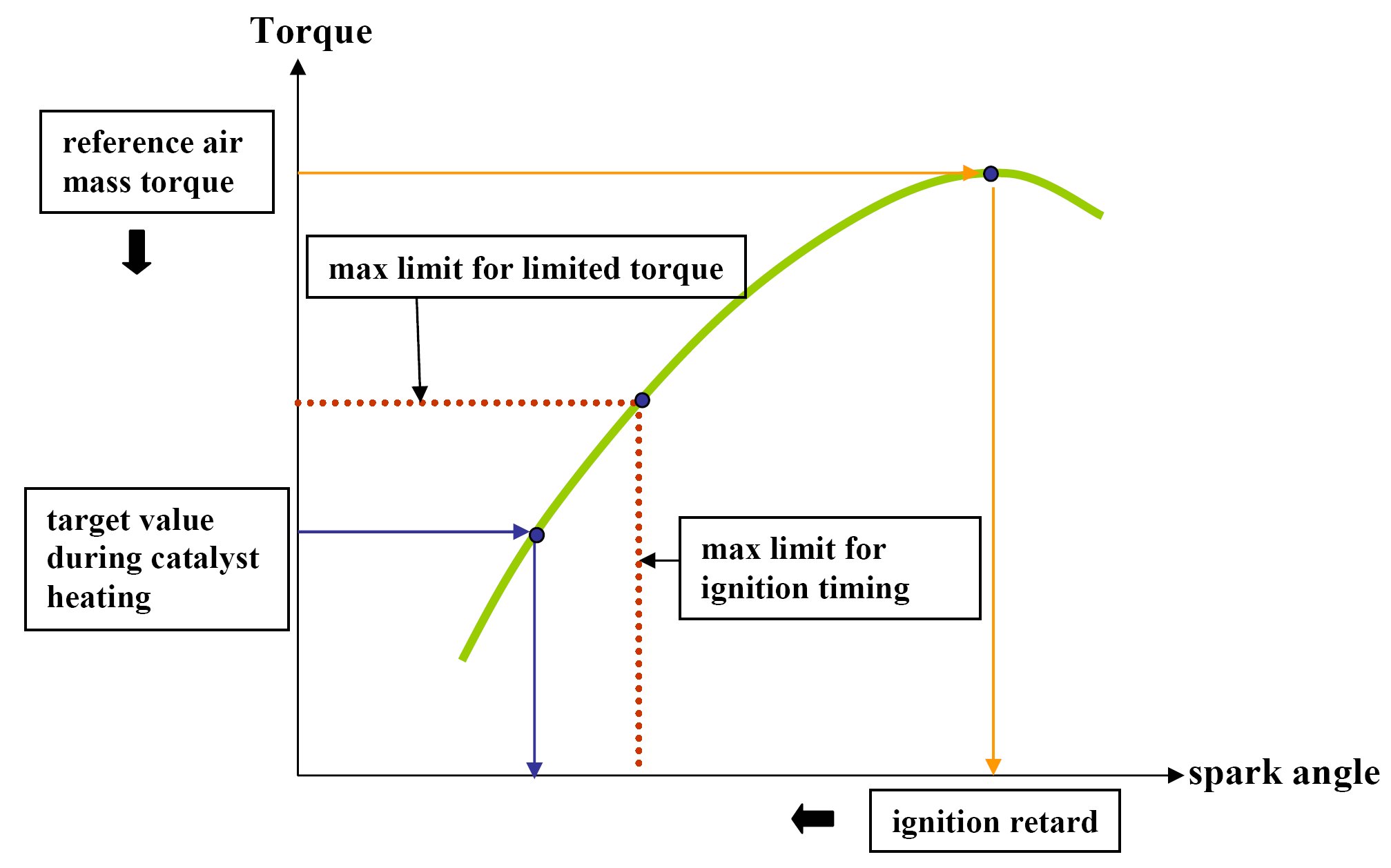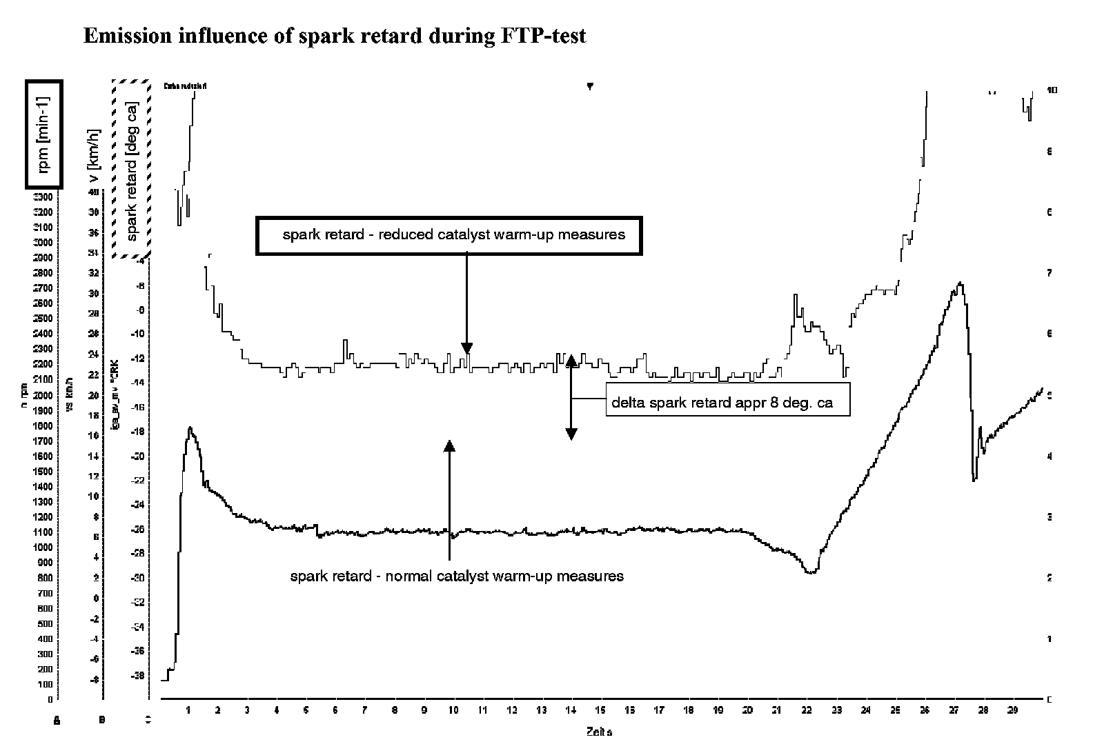 violet: spark retard , 35% reduced catalyst warm-up measures which is equal with the maximum possible reduction of the spark retard for catalyst heating. The delta (app. 8 degrees CA) as shown above is the maximum possible take back of the catalyst heating because of spark retard.