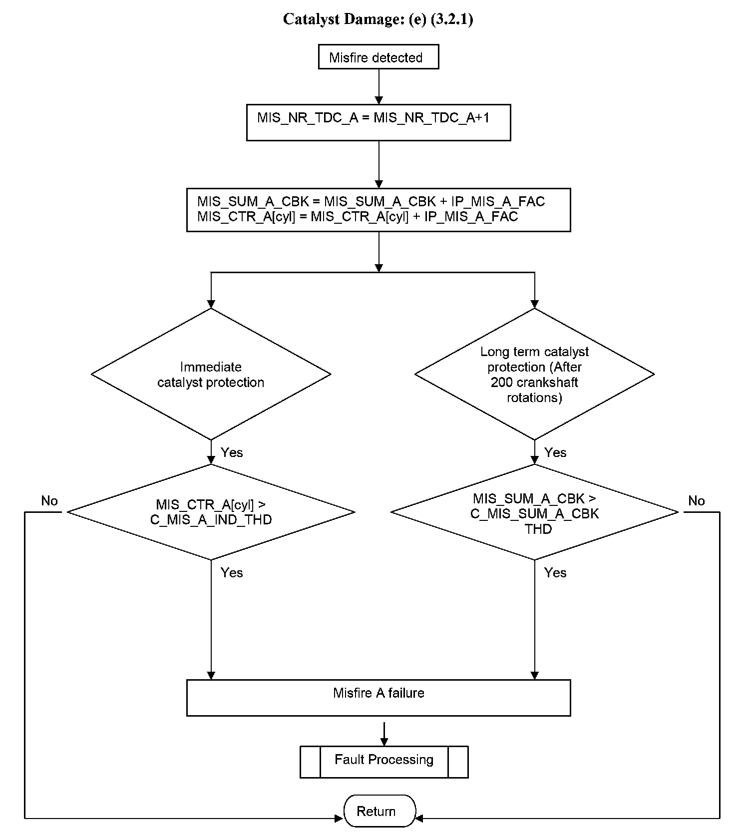If the weighted sum of individual cylinder(s) misfire counters within 200 rotations is exceeding a predetermined value, or the weighted sum of misfire counter per bank exceeds a predetermined value at the end of 200 rotations, then the fault code for catalyst damage relevant misfiring is stored and the cylinder with the highest rate will be switched off, and the MIL will be switched on immediately.
