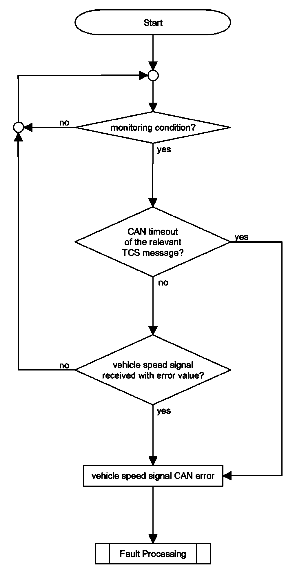 The purpose of this diagnostics is to detect vehicle speed CAN errors. This can be a time-out of the messages which contain the vehicle speed signals or a signal received with error value.