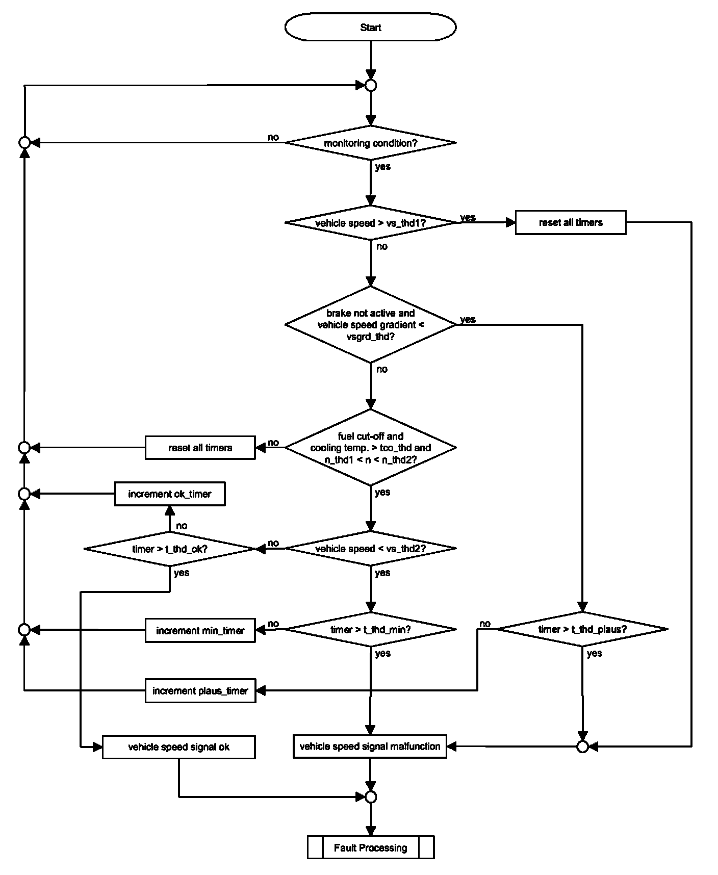 The vehicle speed signal is diagnosed as not faulty if during closed throttle fuel cut-off the vehicle speed is above the appropriate threshold.