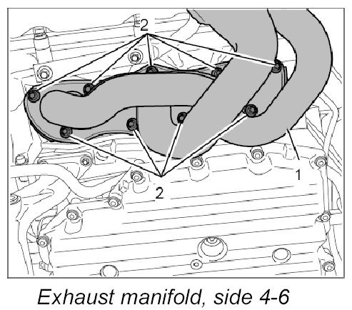 2. Unscrew nine M8 x 21 external Torx fastening screws -2- and remove exhaust manifold.