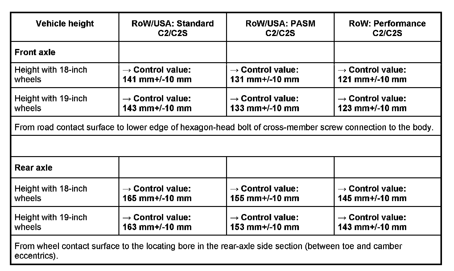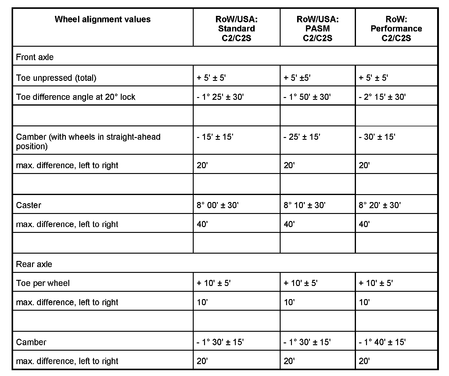 Adjustment values for suspension alignment