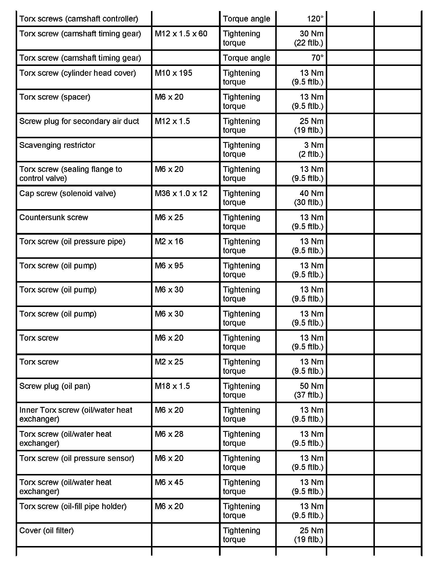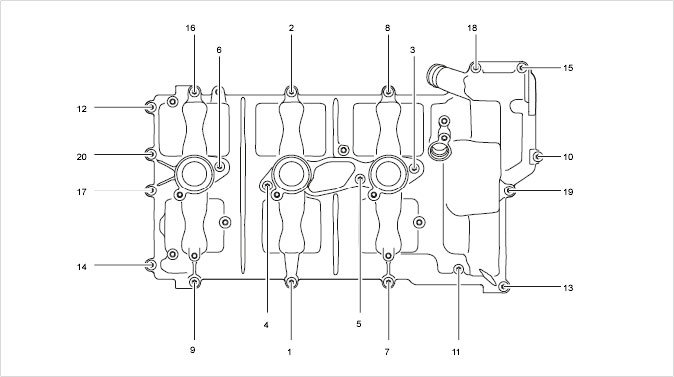 3 - Cylinder head screw - Initial tightening: 5 Nm (3.5 ft lb.) - Tightening torque: 50 Nm (37 ft lb.) Loosen all screws and then tighten them again - Initial tightening: 5 Nm (3.5 ft lb.) - Tightening torque: 12 Nm (9 ft lb.) - Torque angle: 60° - Torque angle: 60°