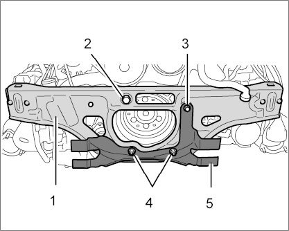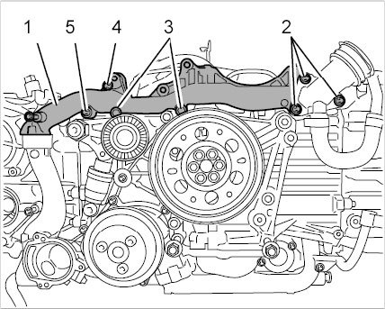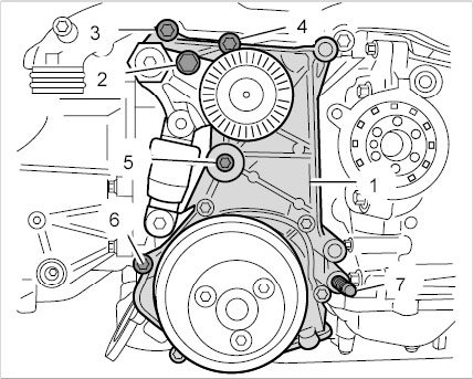 45. Remove unit carrier (coolant distributor housing). The screws for the engine connection piece -2- and the additional attachment for the coolant pump bracket -3 (left) and 5- have already been removed.
