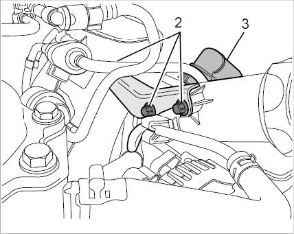 13.1. Unscrew one external Torx screw (E10, M6 x 12) -2- used to secure the cable duct to the intake-air distributor.
