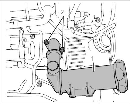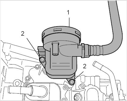 25.1. Unscrew two external Torx screws (E10, M6 x 25) -2- and pull off the oil separator. Replace O-rings.