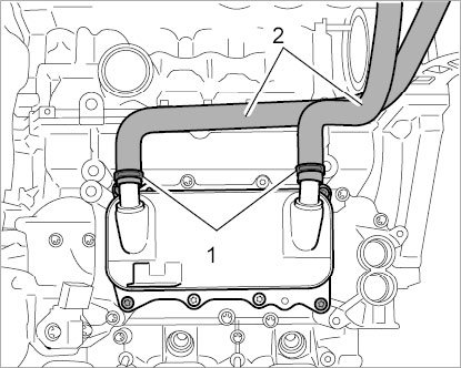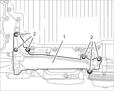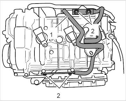 14. Loosen holder at the oil-fill pipe. To do this, unscrew three external Torx screws (E10, M6 x 12) -2-.